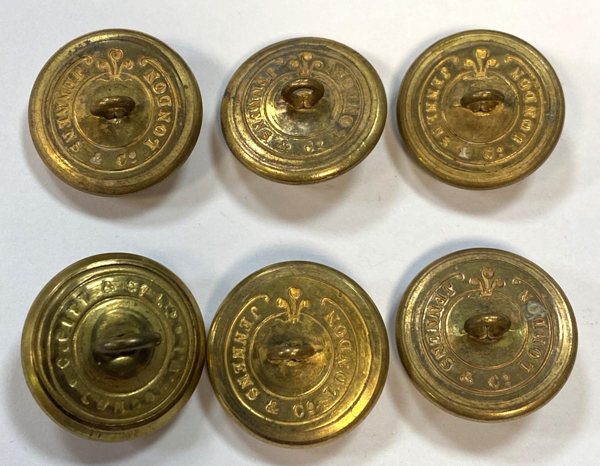 Six brass buttons with maker stamps to reverse, five with 'JENNERS OF LONDON' ' and one with C.PITT & CO'