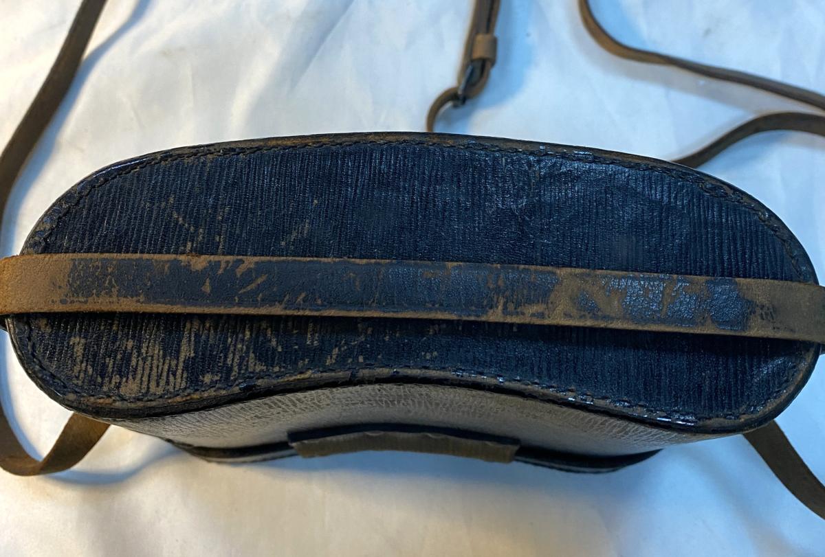 Private purchase black leather case with strap.One of the strap fittings has been repaired.