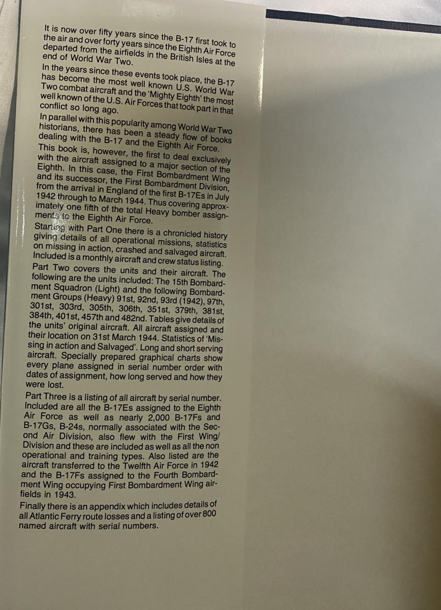320 Page hardback book dealing with the Flying Fortresses of the First Bombardment Wing of the Eighth Air Force.
