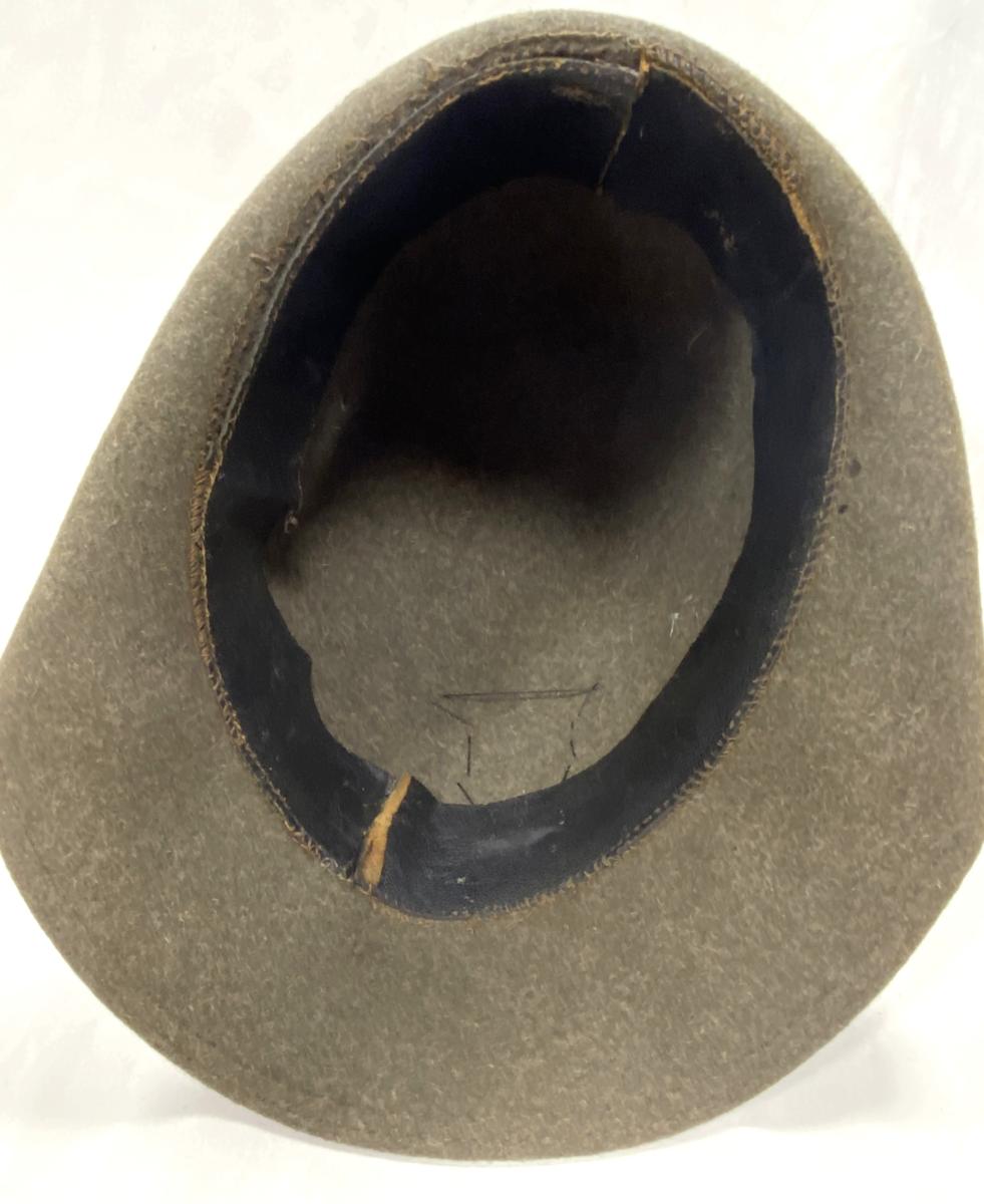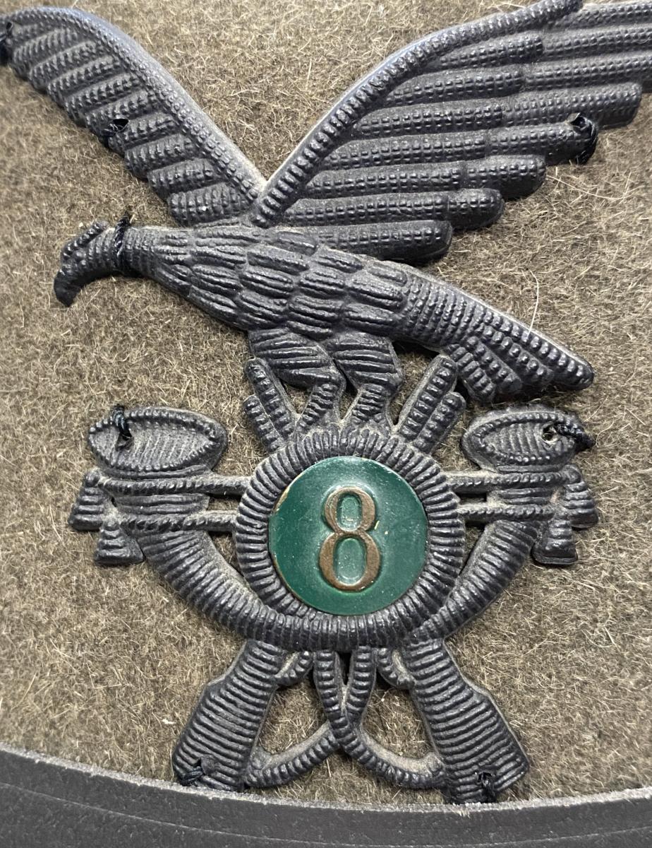 Good condition with stitched badge to front with enamel green regimental number 8. Interior black leather sweatband present. Feather in good condition. Two grommets missing. .