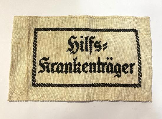 (Code: 1409) | |  Auxilliary stretcher bearer armband. White cotton rayon blend construction with machine woven black gothic script. |