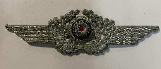 (Code: 2397) | |  Hand embroidered breast eagle in silver aluminium bullion threads on dark green wool base with backing cloth. Worn condition. |