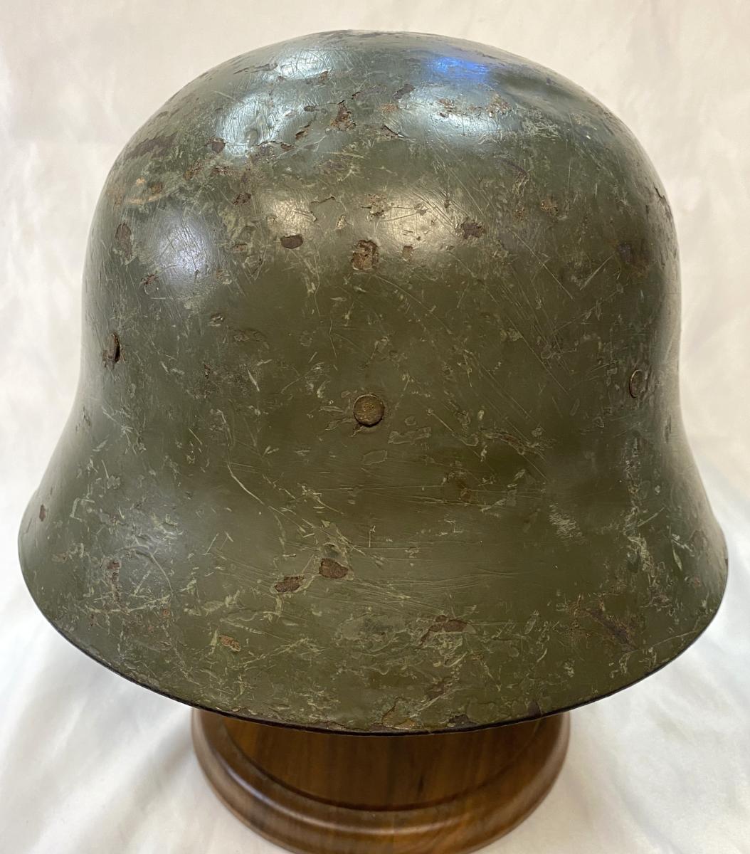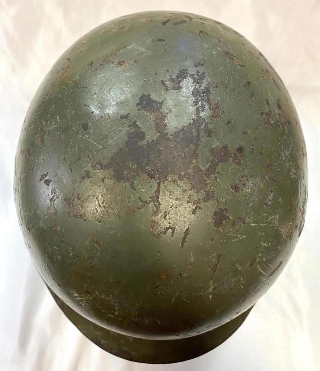Spanish Modelo Z M42 Army Combat Helmet from the 1950-1970's era. Complete with original liner. M42/79 Liner system is complete and in good condition. Canvas green chinstrap complete. High amount of original green paint remains with some rusting to helmet crown. Badge retainer from front of helmet has been removed.