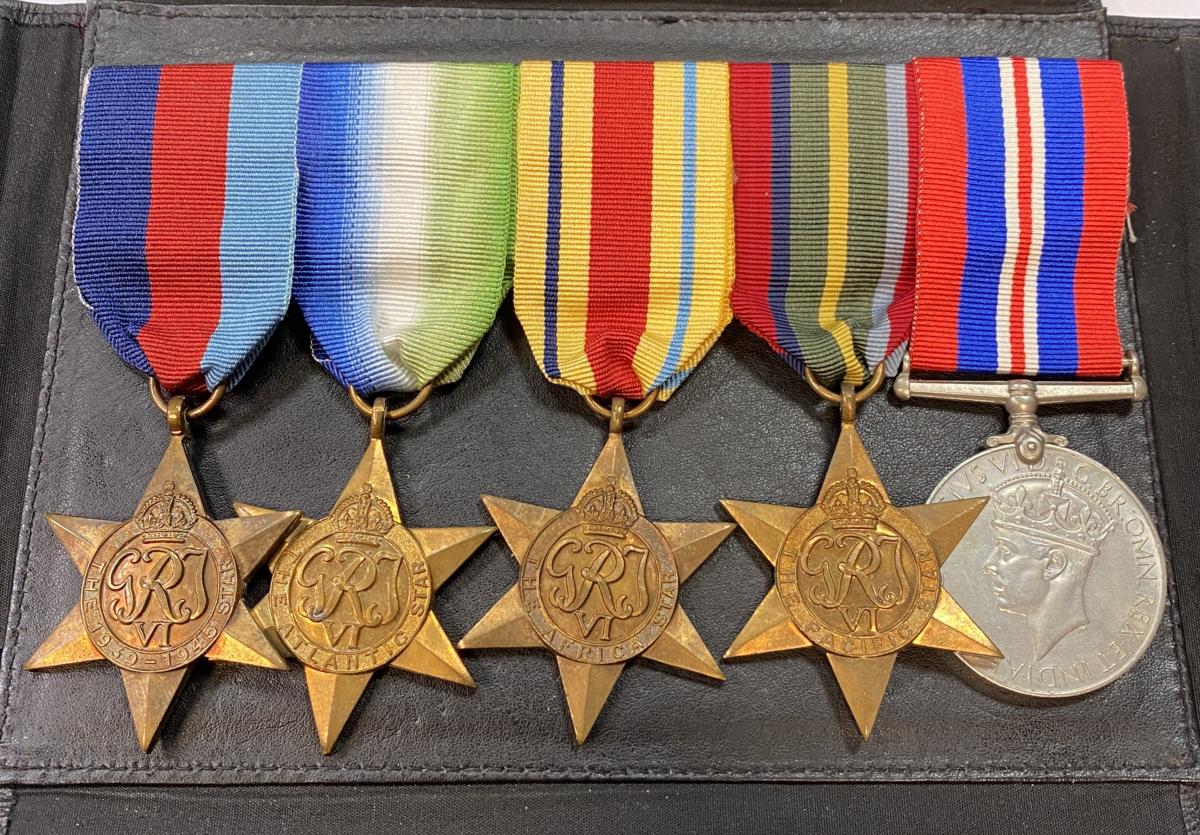 Comprises 39-45 star, Atlantic Star, Africa Star, Pacific Star, War Medal. Medals come in black leather medal wallet with gilt embossed Merchant Navy badge to front.
