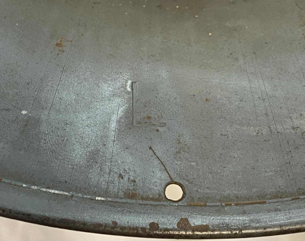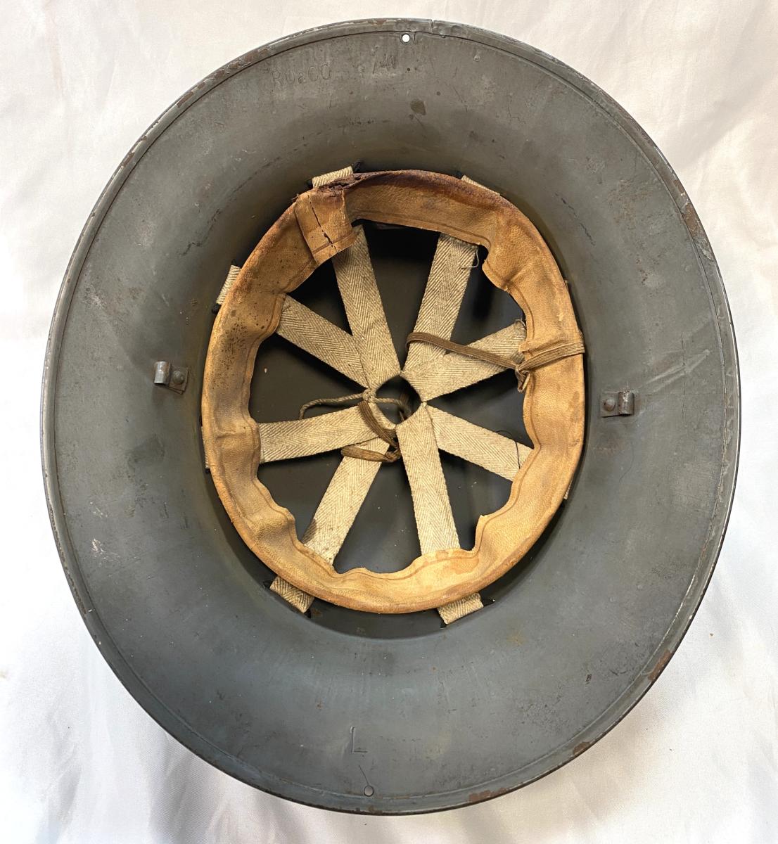 Civil Defence helmet with its original grey green paint and original liner. Maker stamped 'RO & CO' for Rubery Owen & Co Ltd a British Engineering firm.