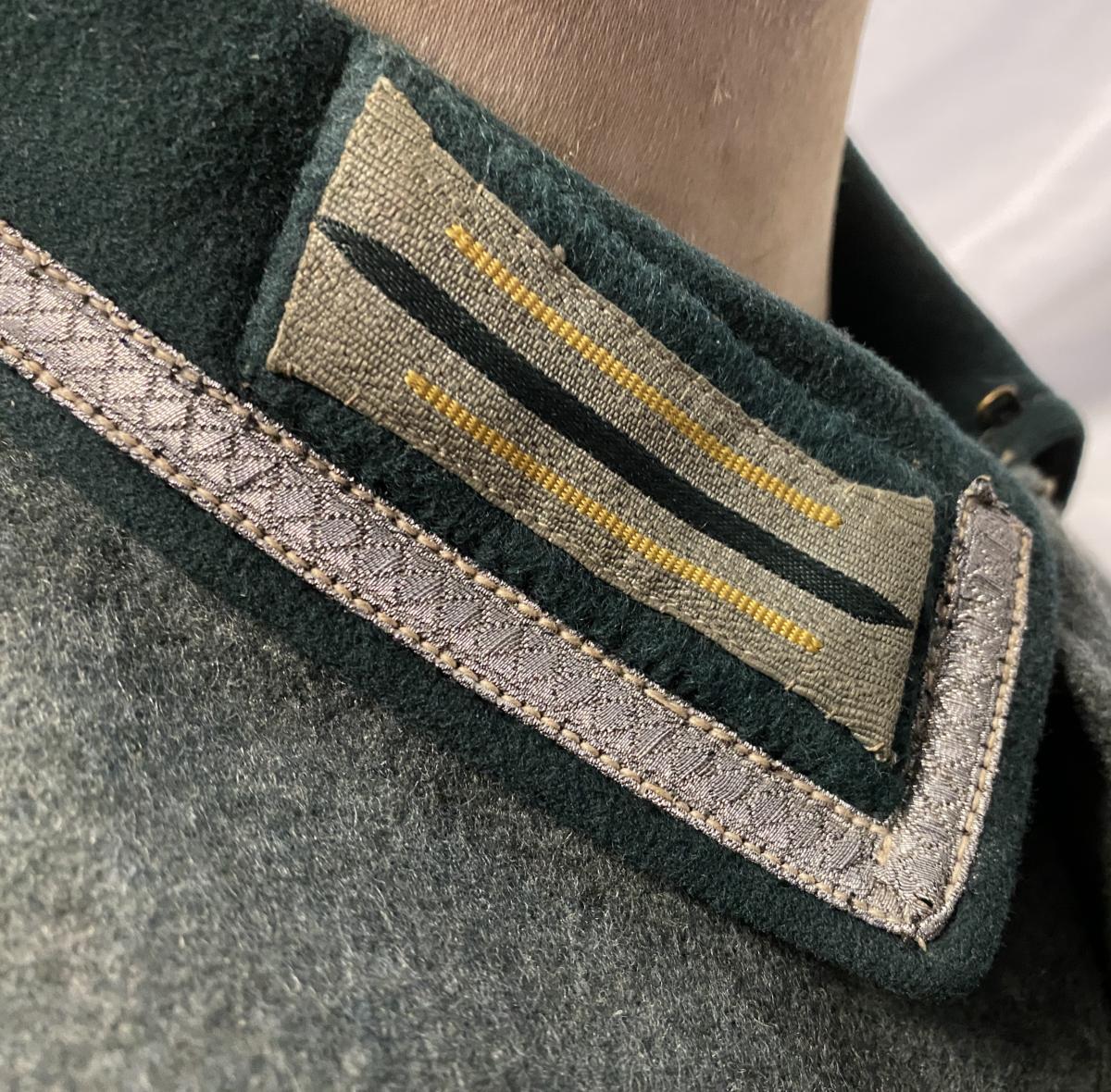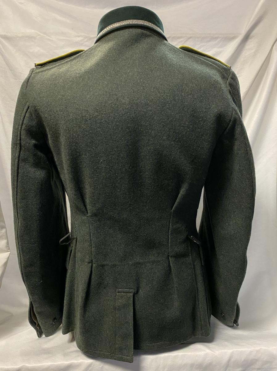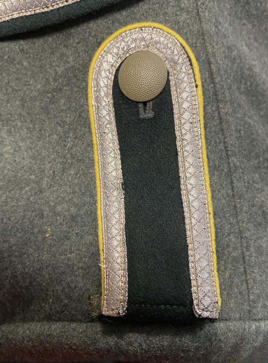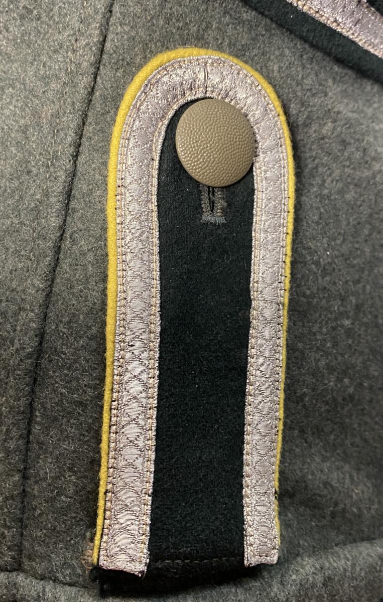 Very nice example of a private purchase M36 tunic. Dark green collar with field grey wool construction tunic with five button front closure. Second button down is secured with a period safety pin. Four pleated front pockets with scalloped button down flaps. Officer quality private purchase bevo breast eagle with machine woven rayon construction collar tabs with lemon colour piping for Signals. Early pattern slip on shoulderboards with silver aluminium tress and lemon waffenfarbe for Signals. Inside size stamped with maker stamp for 'Reitz'. Complete with award loops and belt hooks. Excellent condition.