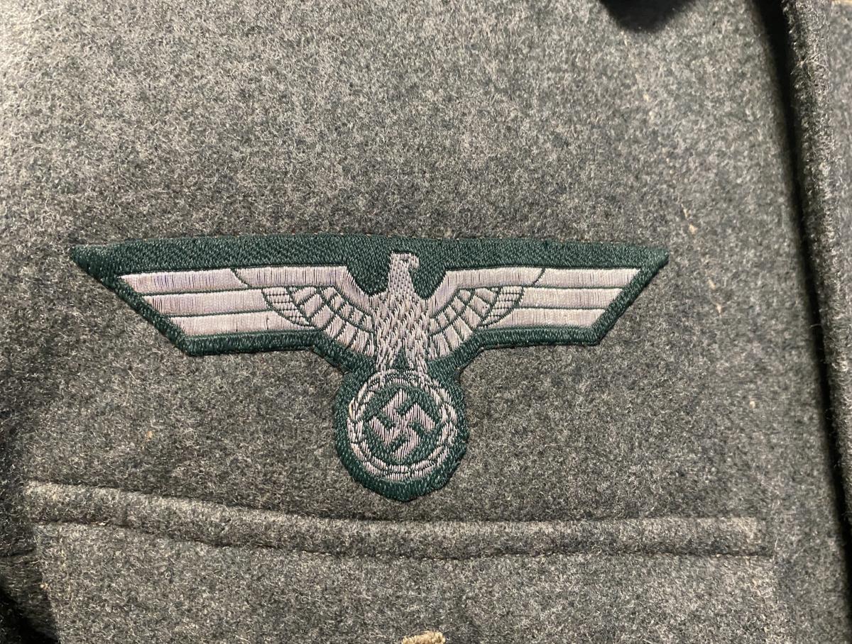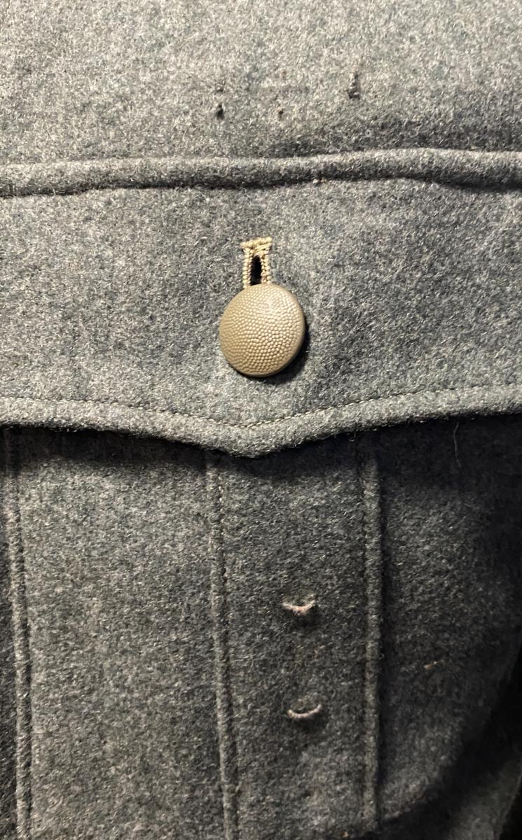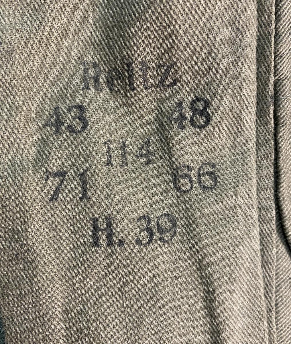 Very nice example of a private purchase M36 tunic. Dark green collar with field grey wool construction tunic with five button front closure. Second button down is secured with a period safety pin. Four pleated front pockets with scalloped button down flaps. Officer quality private purchase bevo breast eagle with machine woven rayon construction collar tabs with lemon colour piping for Signals. Early pattern slip on shoulderboards with silver aluminium tress and lemon waffenfarbe for Signals. Inside size stamped with maker stamp for 'Reitz'. Complete with award loops and belt hooks. Excellent condition.