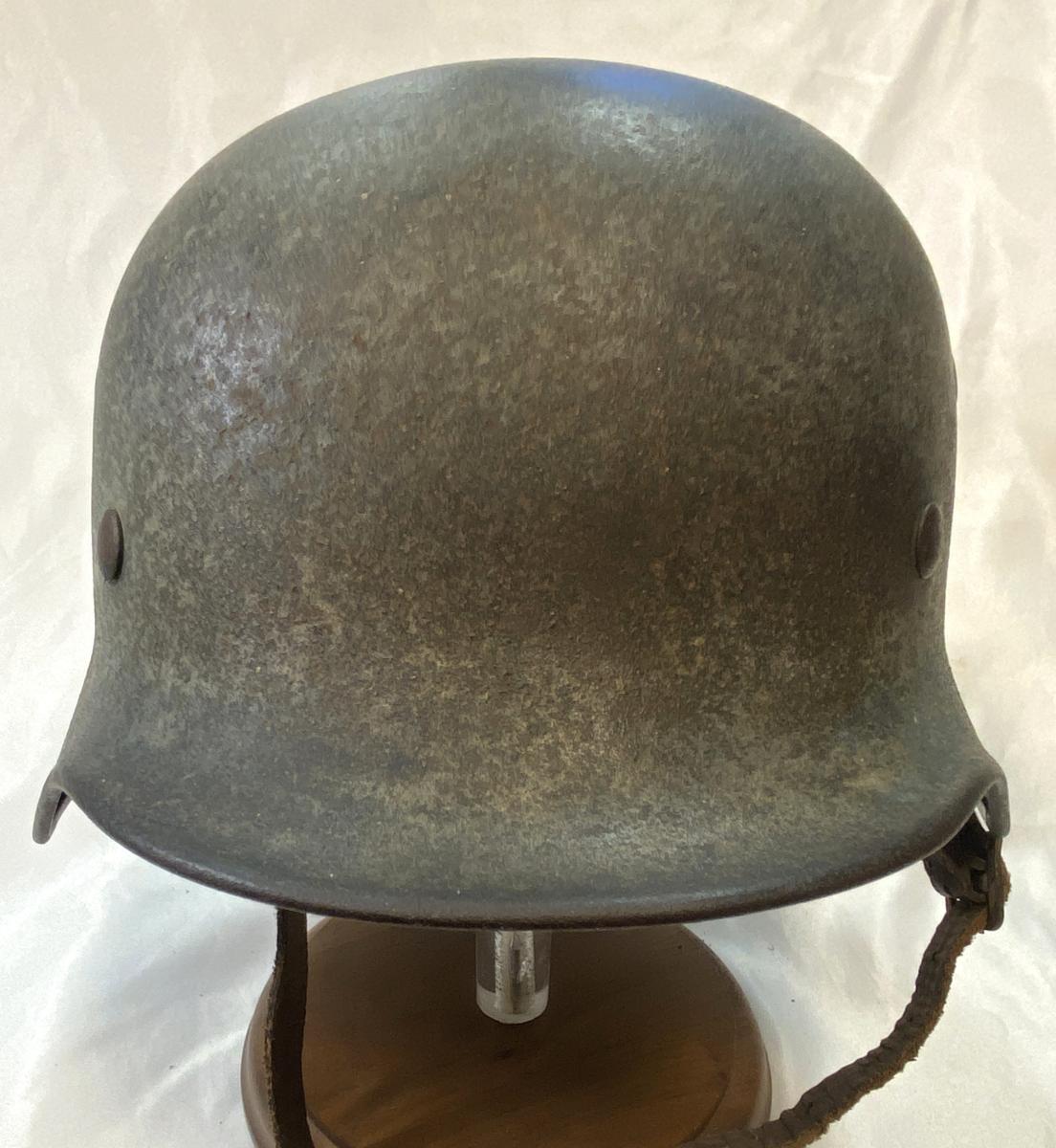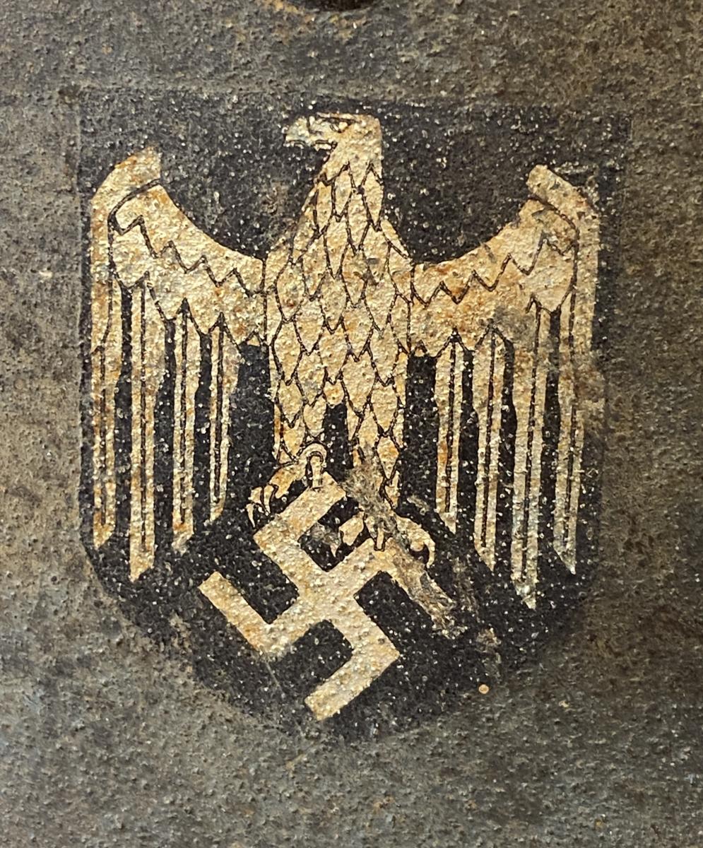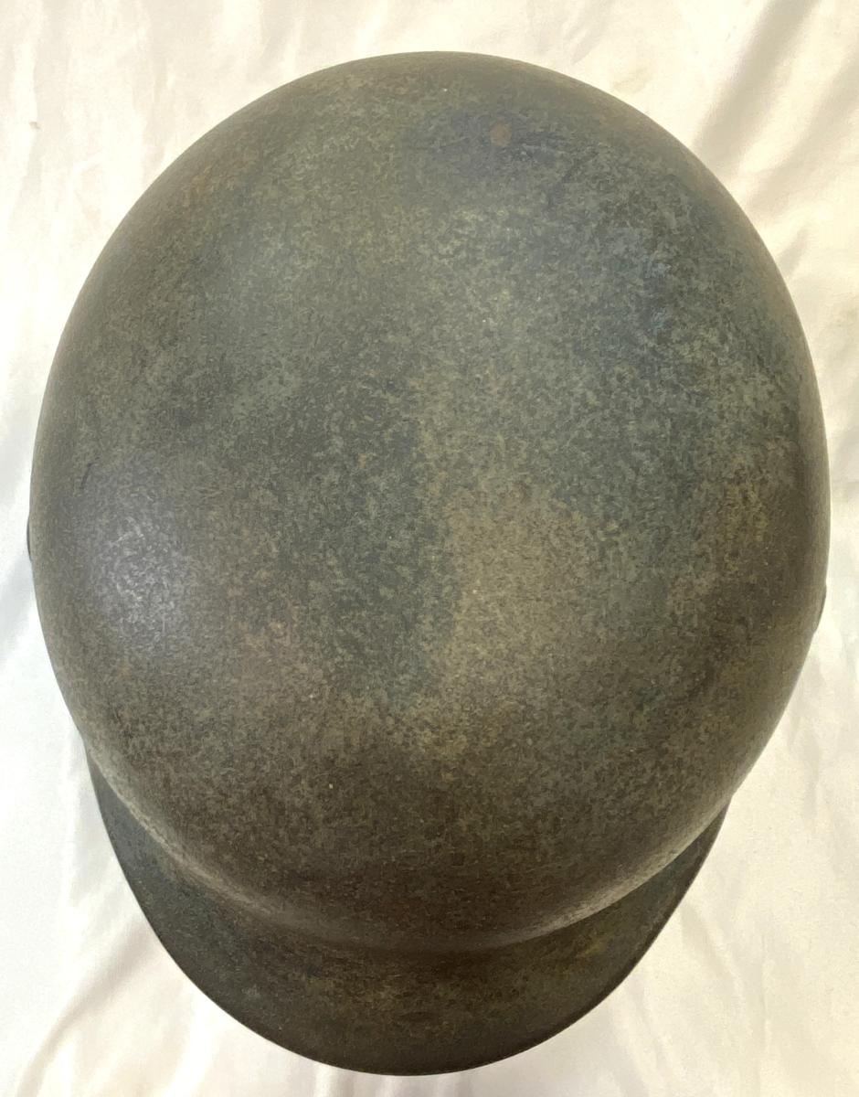 | M40 combat helmet acquired from a veterans family. The soldier brought it back and it has been stored for decades in a garage and forgotten about, literally untouched since the war. As a result it has acquired a degree of oxidisation to the surface, the helmet shell shows a faint amount of light camouflage. The eagle decal is almost perfectly intact with just a small blemish to one leg of the eagle and a small blemish to the swastika. Some rust to interior of the shell, the liner is complete with its original drawstring. Shell size is NS6? with the last number difficult to identify. Batch number stamp D102. We have added a high quality replica chinstrap. A nice looking helmet. |