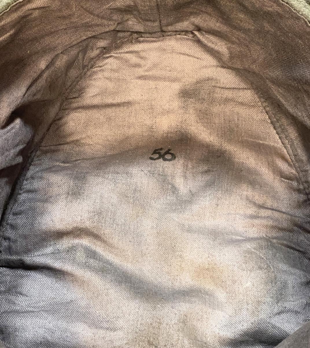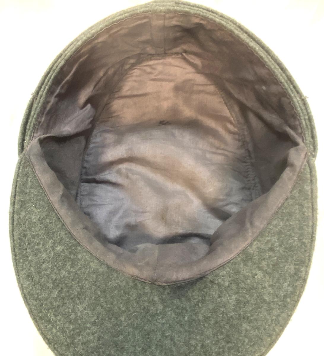 | Feldgrau wool rayon construction cap. Two pebbled metal buttons to front closure flaps. Machine stitched insignia to front comprising trapezoid rayon base with machine woven eagle and swastika above tricolour cockade . Cotton rayon blend interior with 56 size stamp. |