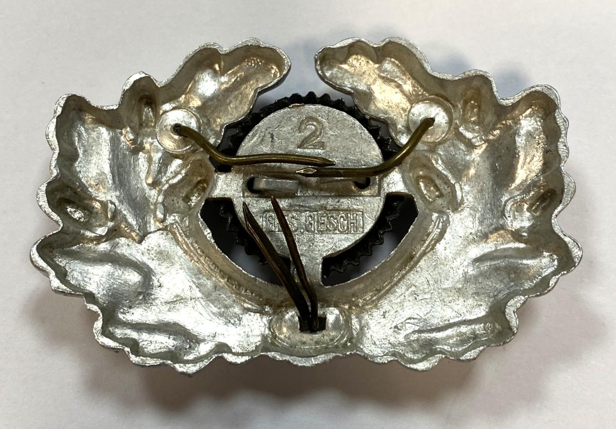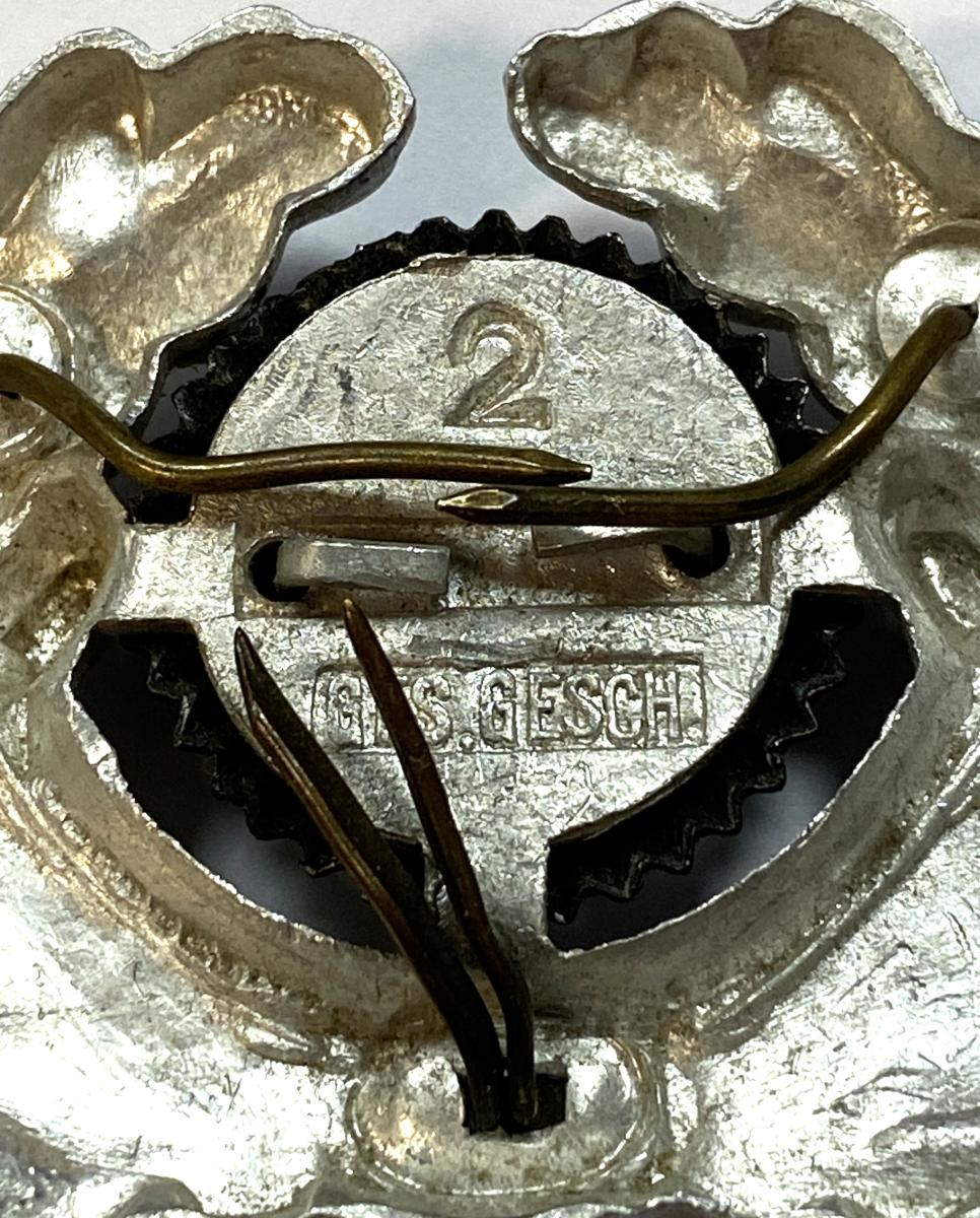 Excellent condition alloy construction wreath with silver wash. Maker stamp number 2 and GES GESCH Stamp. Cockade with red wool centre. All prongs intact.