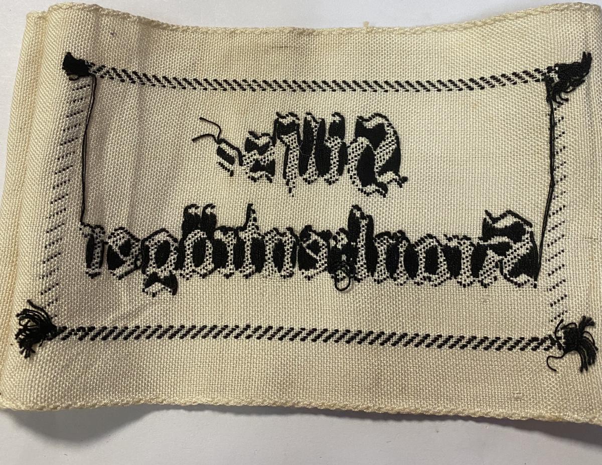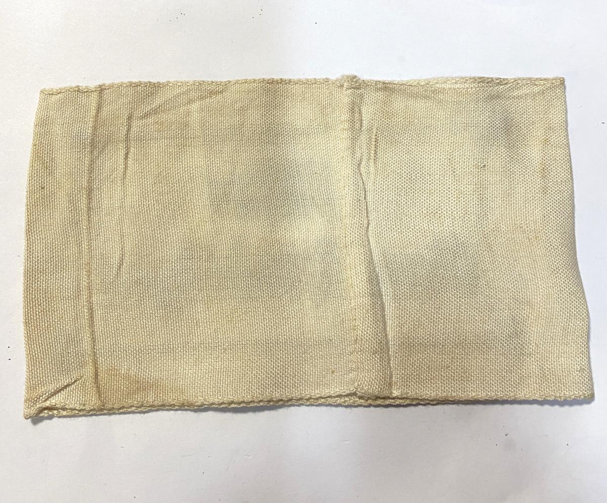 Auxilliary stretcher bearer armband. White cotton rayon blend construction with machine woven black gothic script.