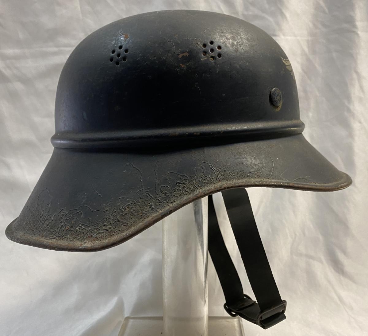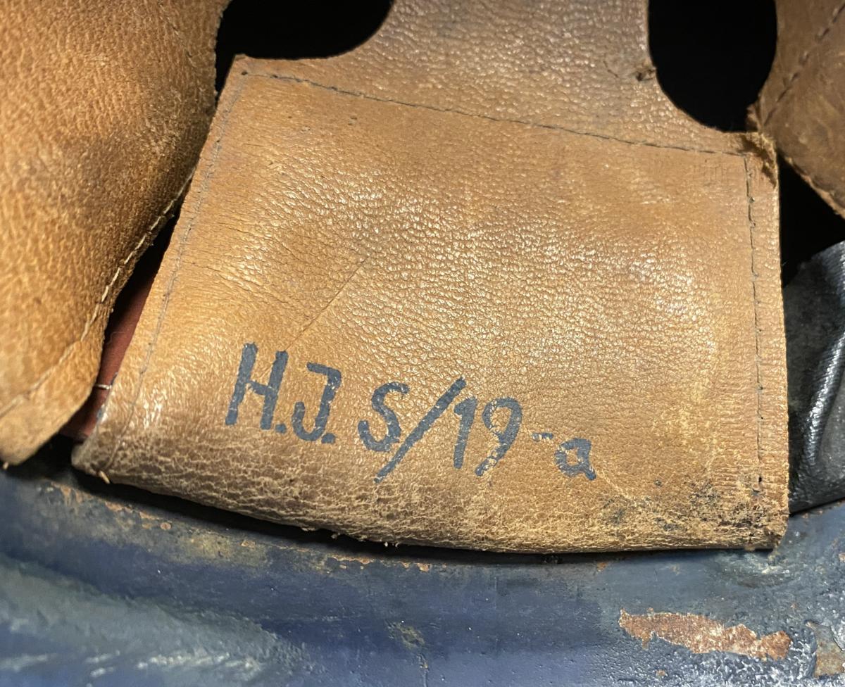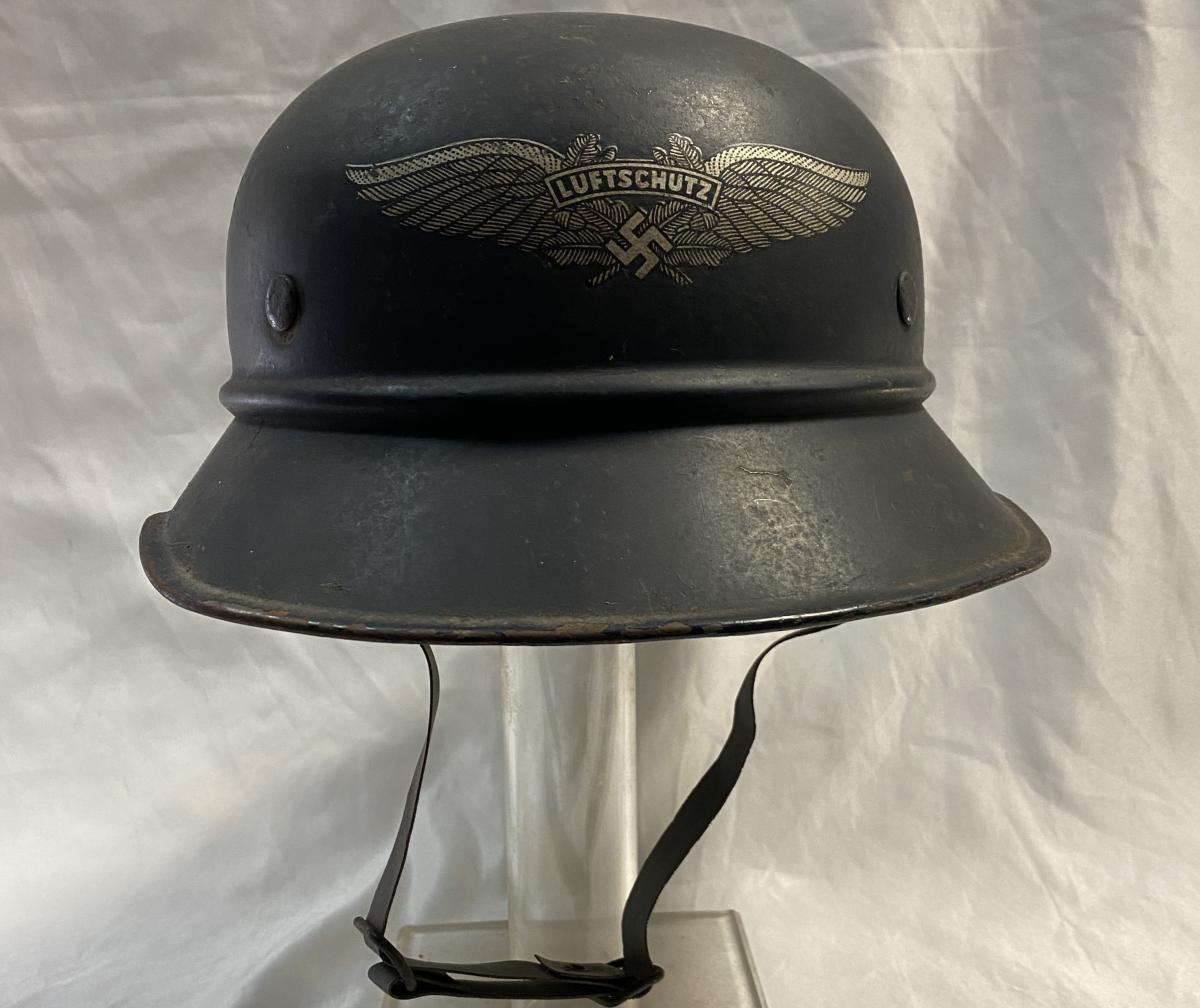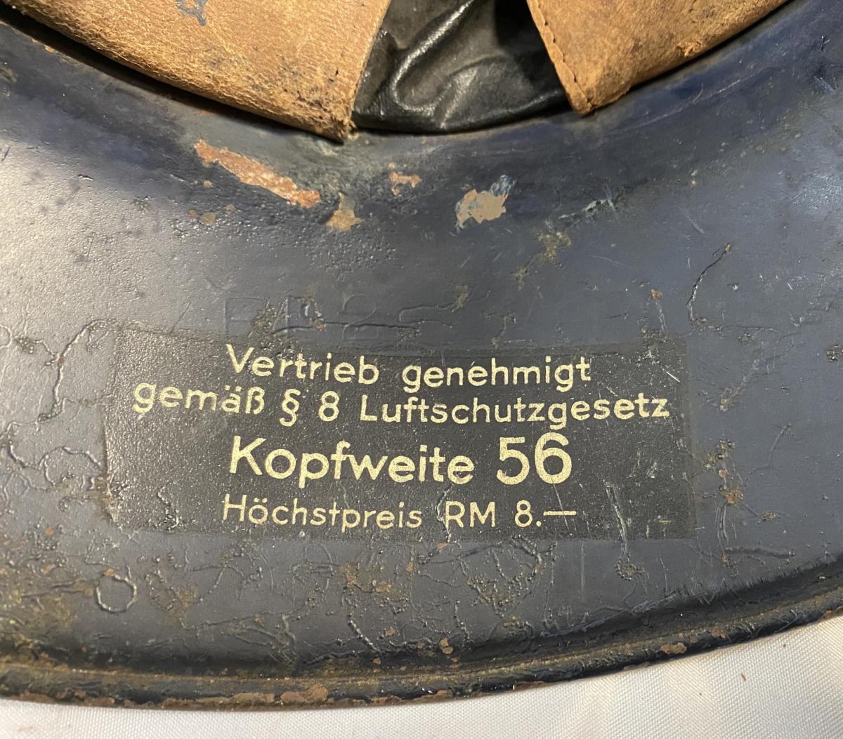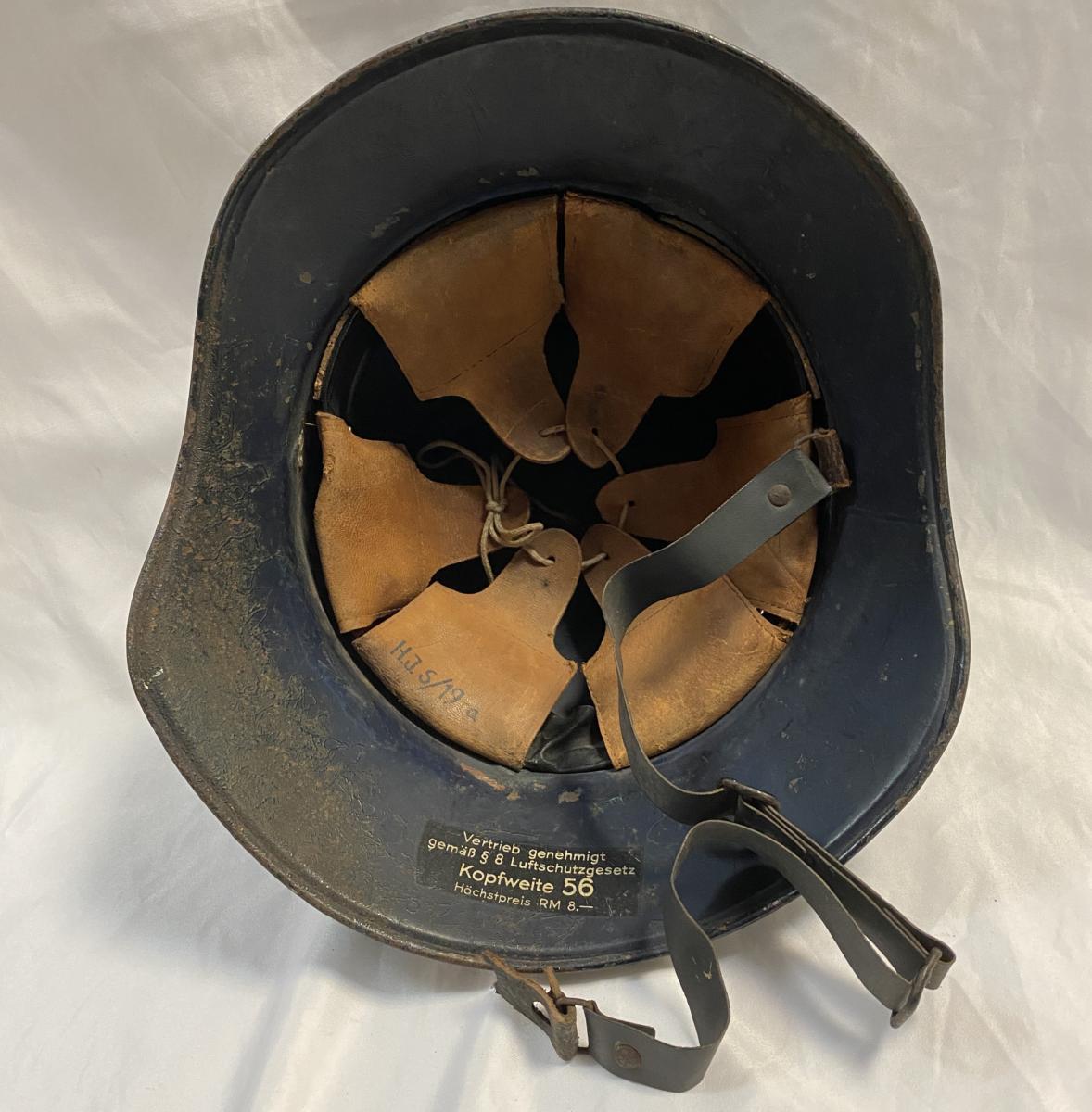 | Dark blue paint with Luftschutz decal in very good condition. The rear inner skirt is stamped with the pricing details including the highest authorised sale price of 8 Reich marks. Complete with liner which is stamped H.J. S/19 a. The strap is snapped at one end. |