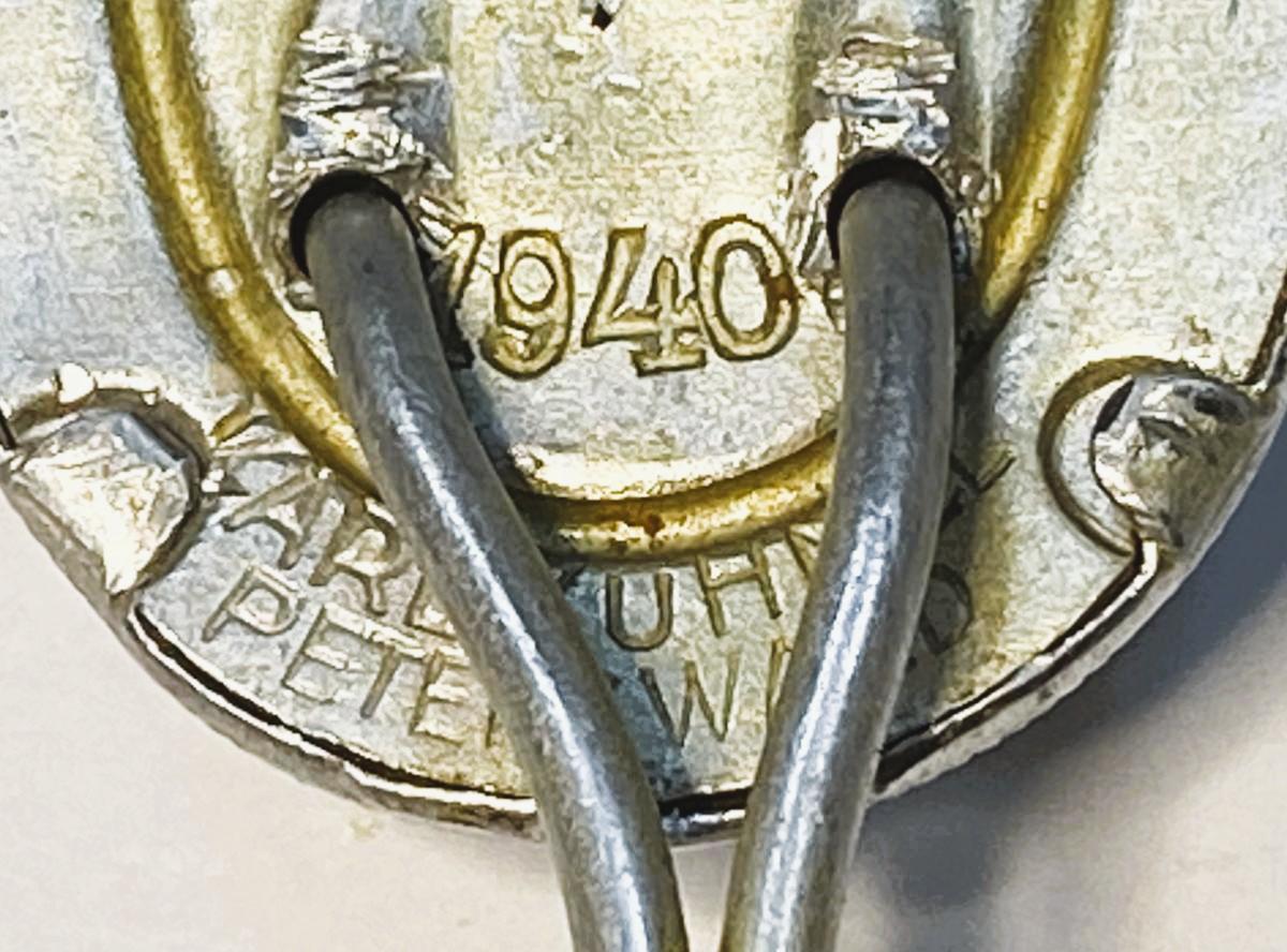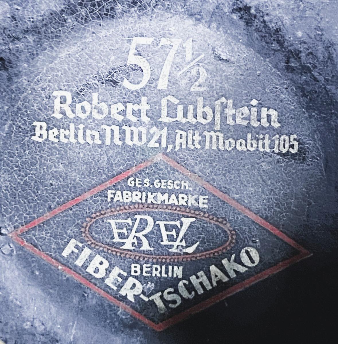 Brown leather and fibre fitted Rural Police Shako. Cockade is dated 1940 and maker marked KARL KUHNEL PETERWALD. Helmet is maker marked ROBERT LUBSTEIN BERLIN. Some wear to green felt body otherwise in good condition with all original fittings.
