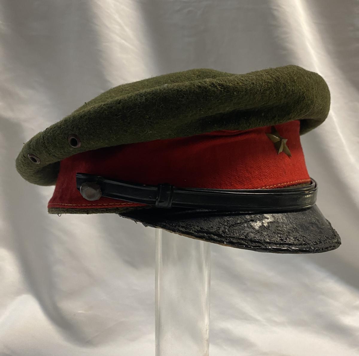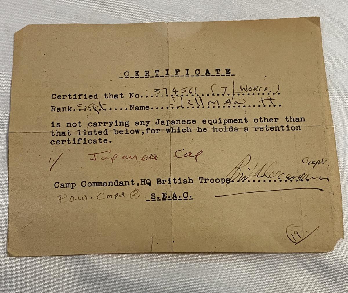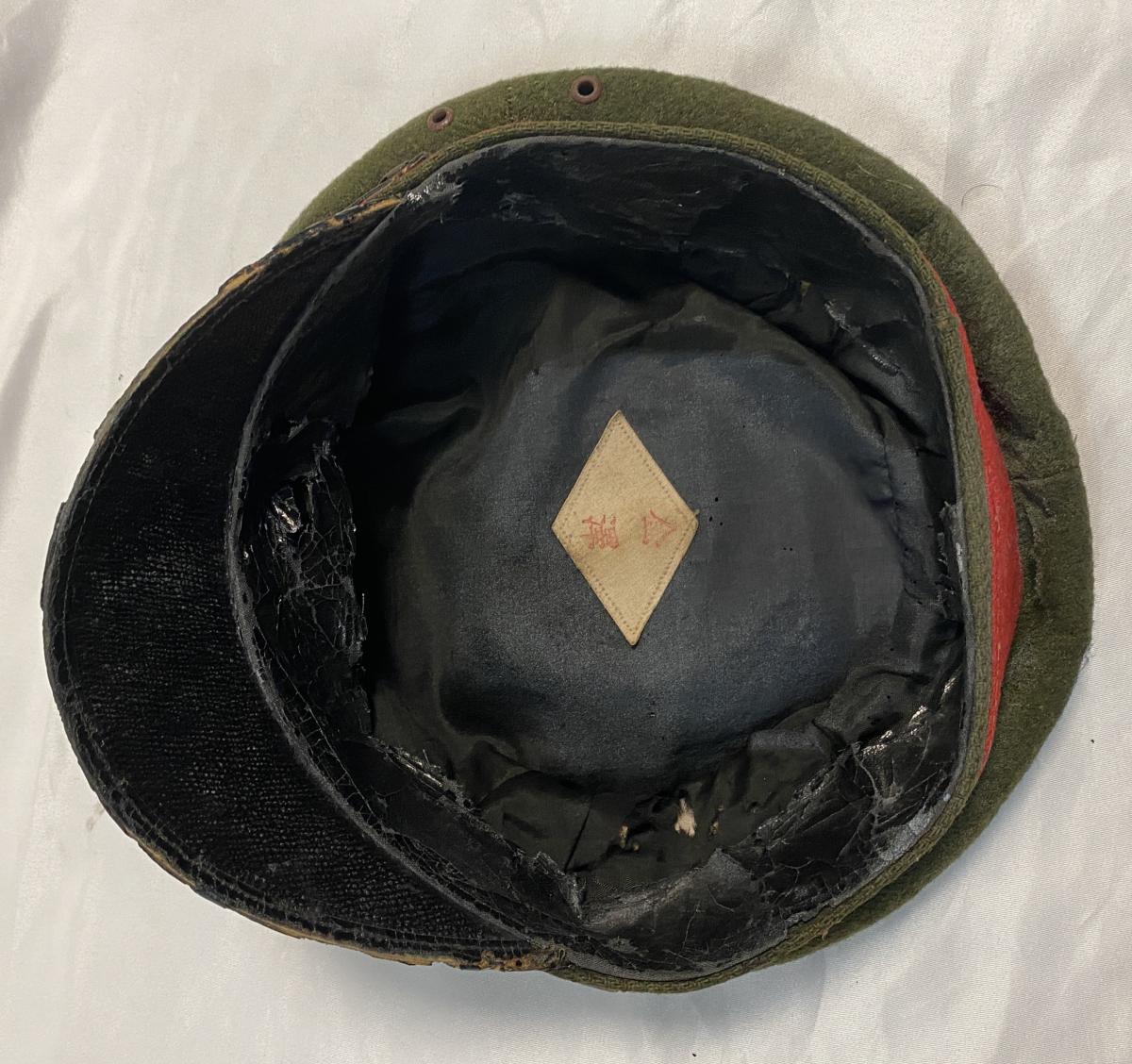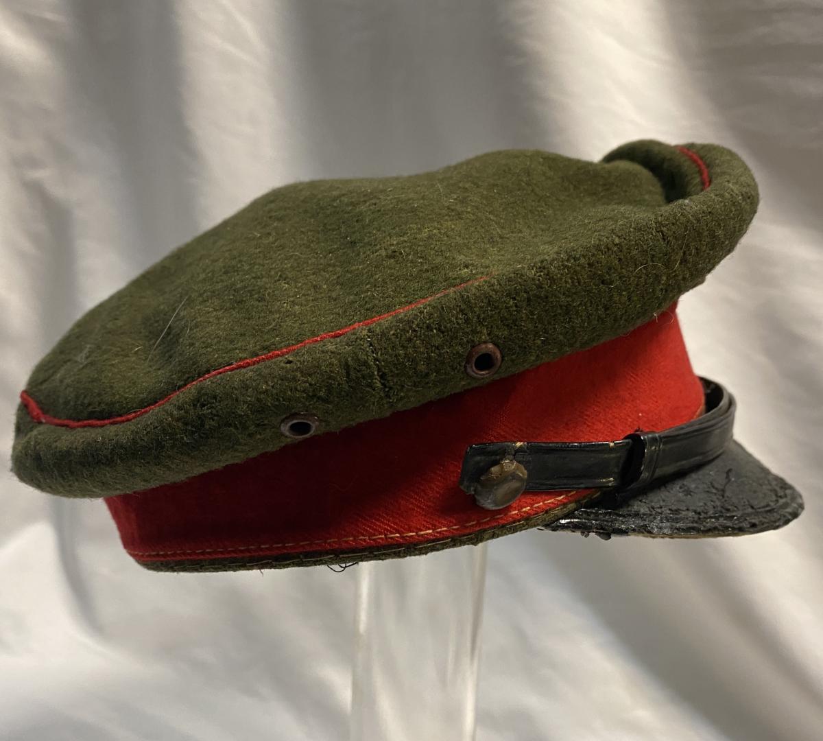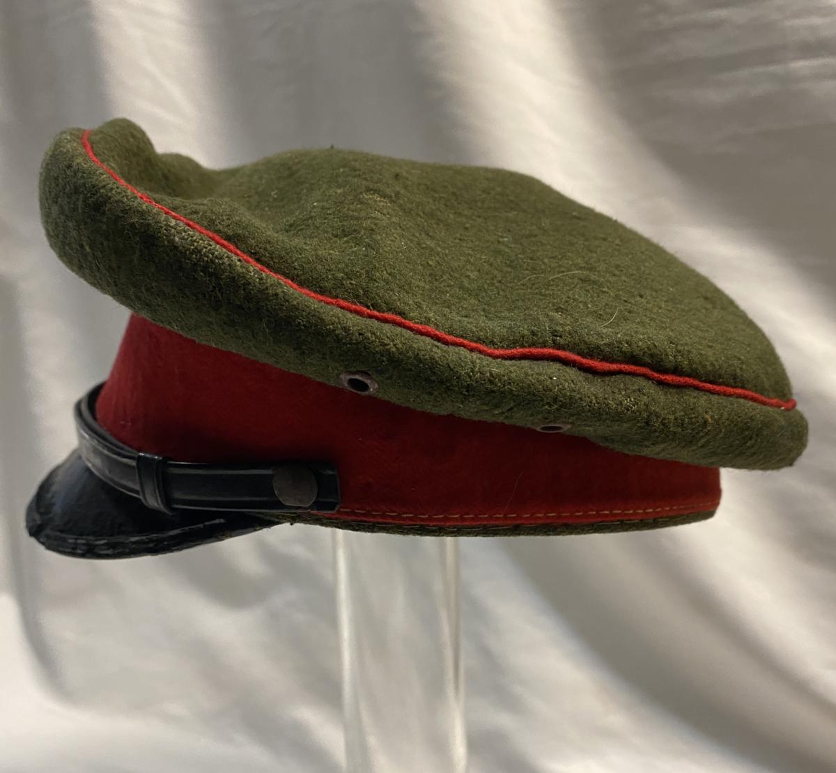 Late war Army officers visor cap made of dark green coarse wool typical of late war manufacture. Cap comes with a certificate from the Camp Commander HQ British troops giving permission for Sgt Dillman of the 7th Worcestershire Regiment to retain the cap.